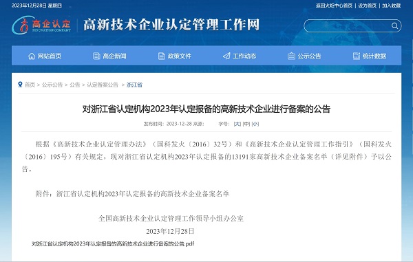 2023年12月28日,全國高新技術企業認定管理工作領導小組辦公室發(fā)布《對浙江省認定機構2023年認定報備的高新技術企業進行備案的公告》,中國能源工程集團有限公司(以下簡稱“中國能源工程集團”)所屬中清能源(杭州) 有限公司...